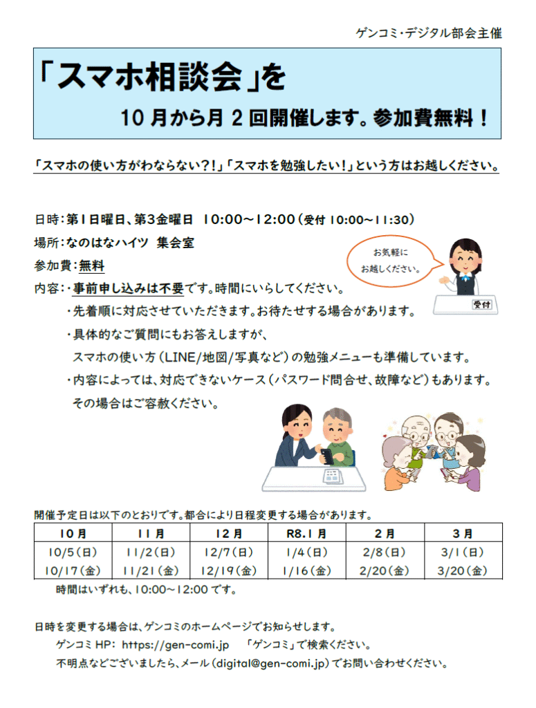 無料「スマホ相談会」を開催します! 10月から月2回、無料のスマホ相談会を開始します。 日 時:第1日曜日、第3金曜日 10:00~12:00(受付 10:00~11:30)場 所:なのはなハイツ 集会室参加費:無料 事前申込みは不要です。直接ご来場ください。 画像をクリックすると拡大表示(PDF表示)できます Post Views: 239