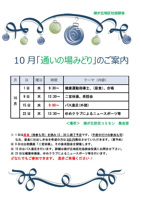 10月 緑が丘地区「通いの場みどり」のご案内 緑が丘地区「通いの場みどり」は地域のコミュニティの場です。お気軽にご来場ください。(次の画像をクリックすると拡大表示されます) Post Views: 29