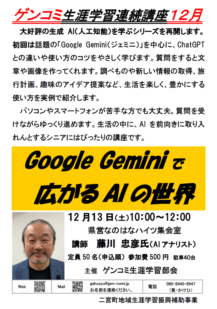 大好評の生成AI(人工知能)を学ぶシリーズを再開します。初回は話題の「Google Gemini(ジェミニ)」を中心に、ChatGPTとの違いや使い方のコツをやさしく学びます。質問をすると文章や画像を作ってくれます。調べものや新しい情報の取得、旅行計画、趣味のアイデア提案など、生活を楽しく、豊かにする使い方を実例で紹介します。