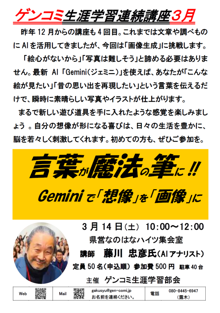 メール申込み gakusyu@gen-comi.jp お名前と講座名をご連絡ください。