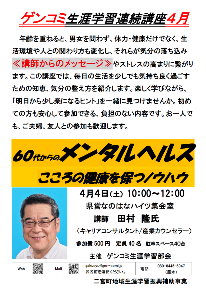 年齢を重ねると、男女を問わず、体力・健康だけでなく、生活環境や人との関わり方も変化し、それらが気分の落ち込みやストレスの高まりに繋がります。この講座では、毎日の生活を少しでも気持ち良く過ごすための知恵、気分の整え方を紹介します。楽しく学びながら、「明日から少し楽になるヒント」を一緒に見つけませんか。初めての方も安心して参加できる、負担のない内容です。お一人でも、ご夫婦、友人との参加も歓迎します。