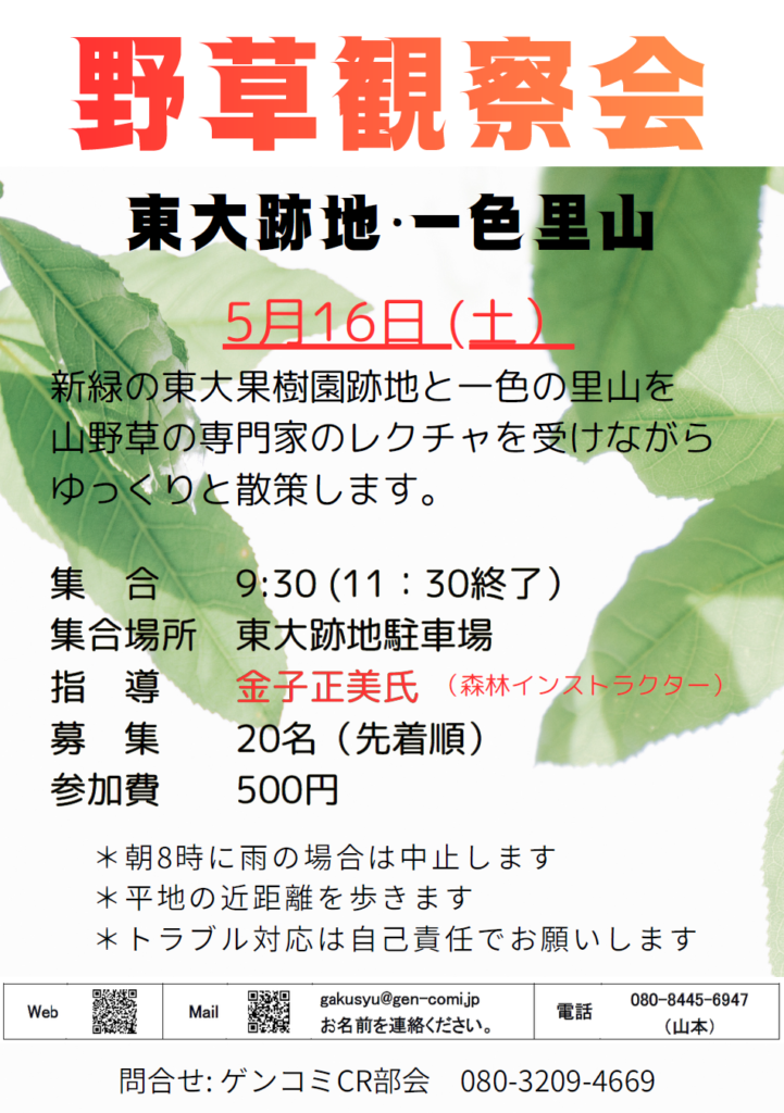 新緑の東大果樹園跡地と一色の里山を山野草の専門家のレクチャを受けながらゆっくりと散策します。